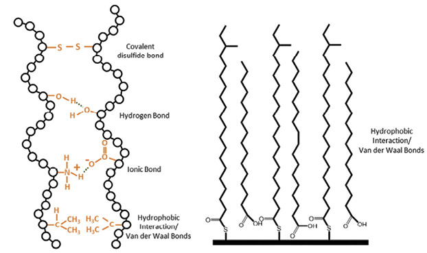 Protein molecules are assembled from linear chains of amino acids joined together with peptide bonds. However, further cross-linking bonds usually shape these proteins into the three-dimensional structures needed for them to function properly; for a review, see Reference 7.7 The different types of cross-linking bonds present in proteins are summarized in Figure 2.