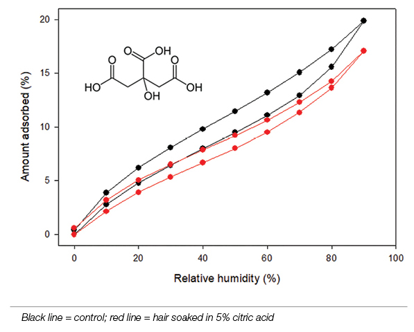 Dynamic vapor sorption studies (see Figure 4) have confirmed that a wide range of mono-, di- and trivalent organic acids can reduce water uptake into the hair.21 Hair swelling studies have also shown that lactic acid, in combination with Ca2+ at a pH of 4.5, can reduce the swelling in bleach damaged hair and, as a result, reduce hair color fade from semi-permanent dyes.22