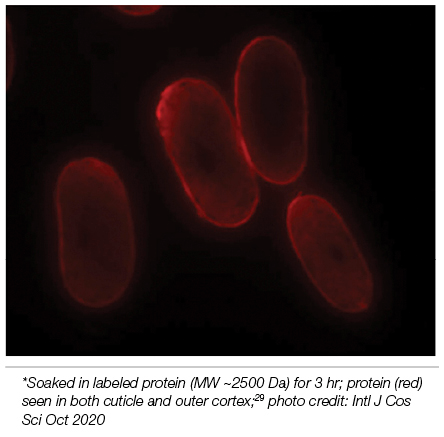 Proteins and peptides: Proteins and peptides have been well-studied as functional ingredients for hair products; for a recent review, see Reference 27.27 Fluorescence microscopy has shown these materials can penetrate hair depending on their molecular weight (see Figure 5).28, 29 Notably, penetration is also better in damaged hair where the cell membrane complex is more permeable.29