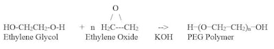The term PEG (polyethylene glycol) refers to a class of polymers having the CAS number 25322-68-3 that are made by the reaction of ethylene oxide with ethylene glycol. This reaction is shown in Table 1.